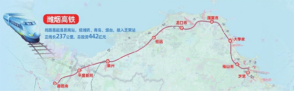 潍烟高铁、莱荣高铁是山东重点交通基础设施项目。其中,潍烟高铁是国家“八纵八横”高铁网中沿海高铁通道的重要组成部分,线路西起昌邑南站,经潍坊、青岛、烟台,接入芝罘站,正线全长237公里,总投资442亿元,全线设昌邑南、平度新河、莱州、招远、龙口市、蓬莱市、大季家、福山南、芝罘9座车站。