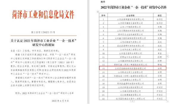 山东百成新材料科技股份有限公司被认定为菏泽市“一企一技术”研发中心企业